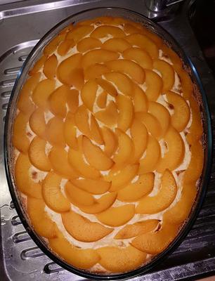 Butter and breadcrumb an ovenproof baking dish and pour the mixture in it. Cover it with sliced Peaches.