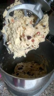 Mix all dried ingredients including dried fruits nuts, baking powder