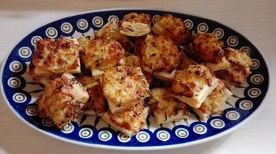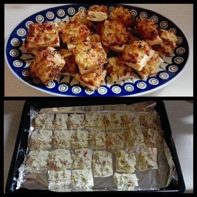 Cut puff pastry (Use frozen puff pastry, thawed) into bite-size pieces (or serving size pieces) and put onto baking sheet.